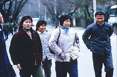| 杭州の街頭で出会った青年労働者たち。冬季であるため、厚手の上着を着用しているが、その色彩はかなりカラフルなものも見かける。表情には屈託がなく、明るい。 |