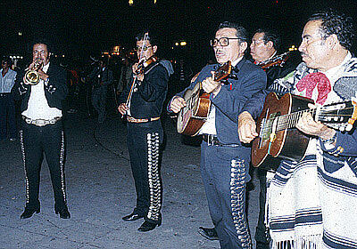 | シウダードメヒコのガリバルディ広場は、夜ともなれば何組ものマリアッチ楽団が技を競い合い、にぎやかだ。地元民には安いが、観光客と見ると高値を要求されるから、事前の交渉が大切だ。 |