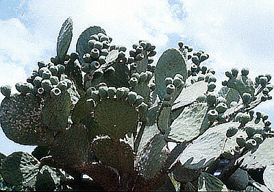 | サボテンもメキシコ原産で世界に広がった植物である。このウチワサボテンの果実は、とげを取り除くのが面倒だが、すこぶる美味だ。後にエジプトやモロッコでも食べる機会があったが、メキシコには到底及ばない。 |