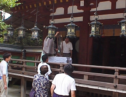 神社の由来の説明を受けた後、正式参拝をし、目的の七支刀を拝見させていただいた。国宝の実物の見学を希望して交渉を続けていたが、結局レプリカしか見せていただけなかった。このレプリカでも一般には公開をしていないもので、きわめて実物に近いものであると説明を受けた。